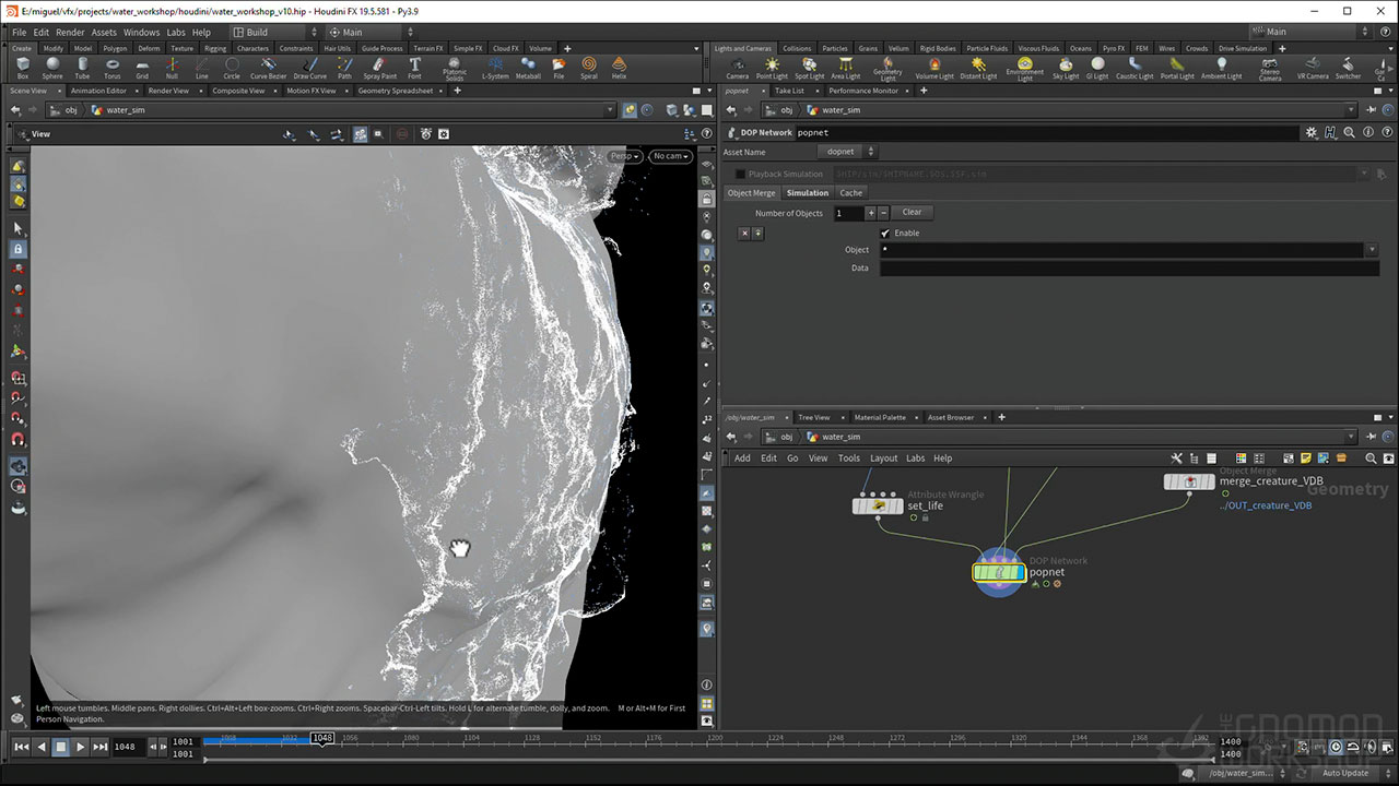 Discover the complete process that goes into executing an epic water simulation shot featuring a sea creature breaching out of the ocean and diving back in. This comprehensive workshop, taught by CG Supervisor Miguel Perez Senent, begins by defining a large ocean surface and then showcasing Houdini’s latest water toolset to simulate interaction with the creature. Using the latest FLIP Solver, you will create the base fluid simulation and dive into tips and tricks to make it more realistic and efficient. You’ll then learn how to generate and blend the mesh of the fluid with the rest of the ocean using some clever techniques and discover how to use the result to define a custom whitewater emission source based on the mesh surface properties and physical characteristics.