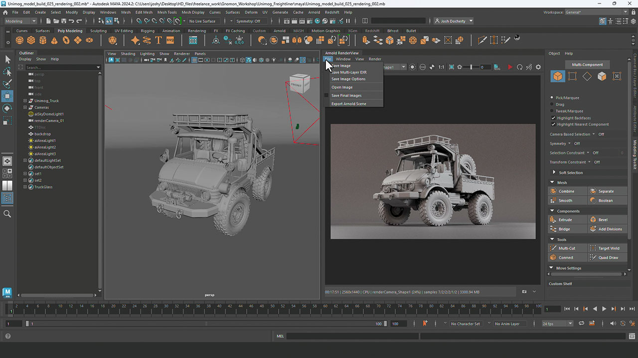 The references used for this workshop are from Bring a Trailer, and the HDRI featured is from PolyHaven. Josh uses PureRef, Maya, Arnold, Redshift (optional), Lightroom & Photoshop as his tools of choice, though the techniques demonstrated can be applied to other software.