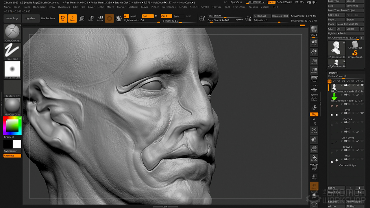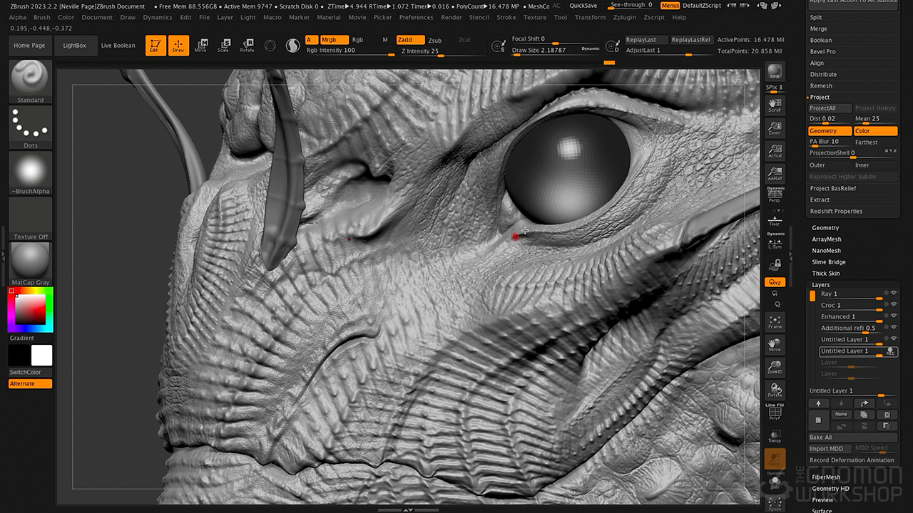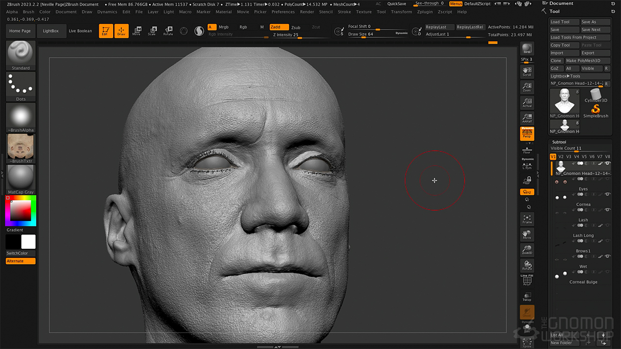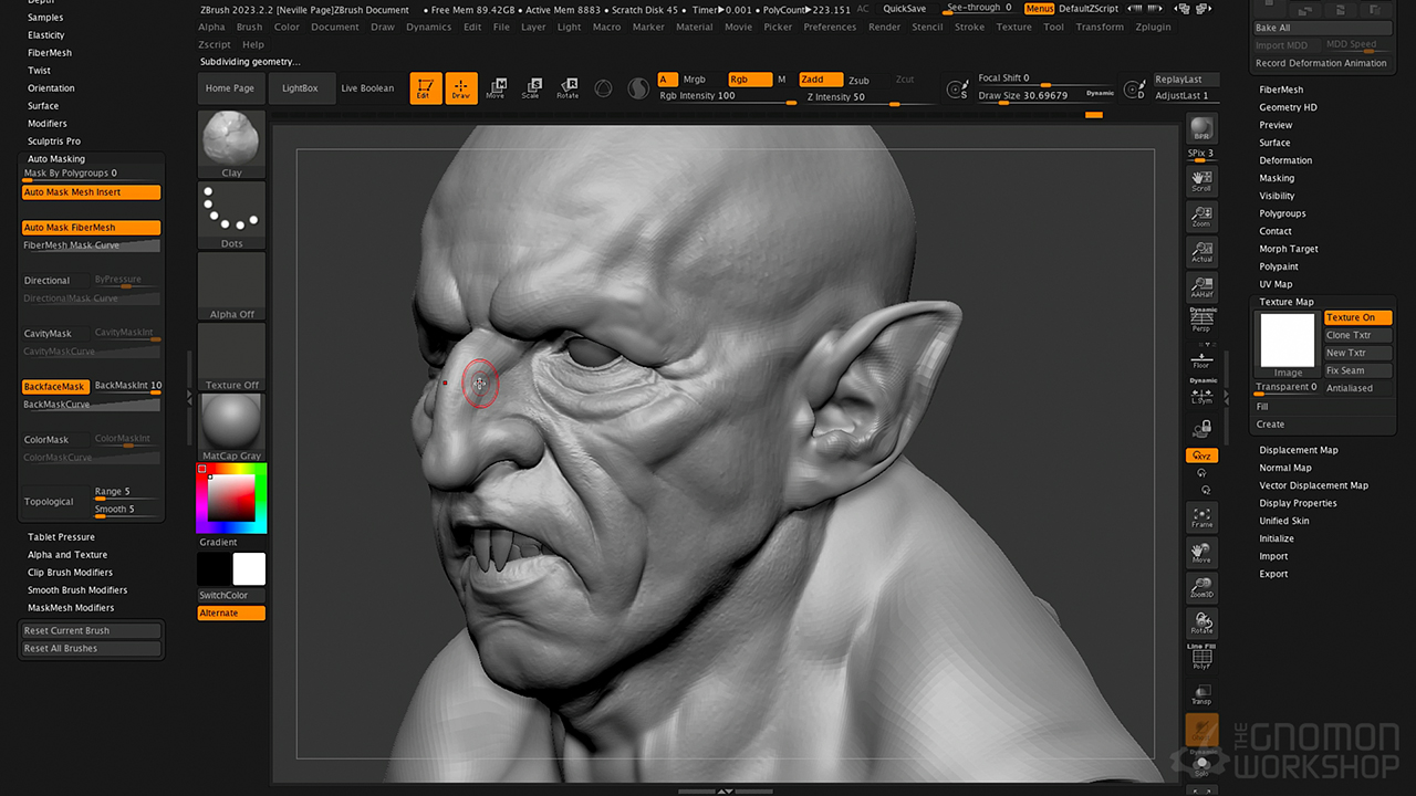 In this insightful workshop that teaches how to create virtual designs that will be turned into practical makeup, Neville begins with the skin: a head scan of himself. Using this head scan data, he demonstrates how to work on top of it in ZBrush, just as he would if he were working with a physical life cast; only, rather than working with real clay, he’s using digital clay to build up the design. Artists can follow along as he designs and builds a character from the ground up, ensuring anatomical believability, practical feasibility, and a strong design foundation while also seeing how he tackles mistakes and happy accidents along the way.