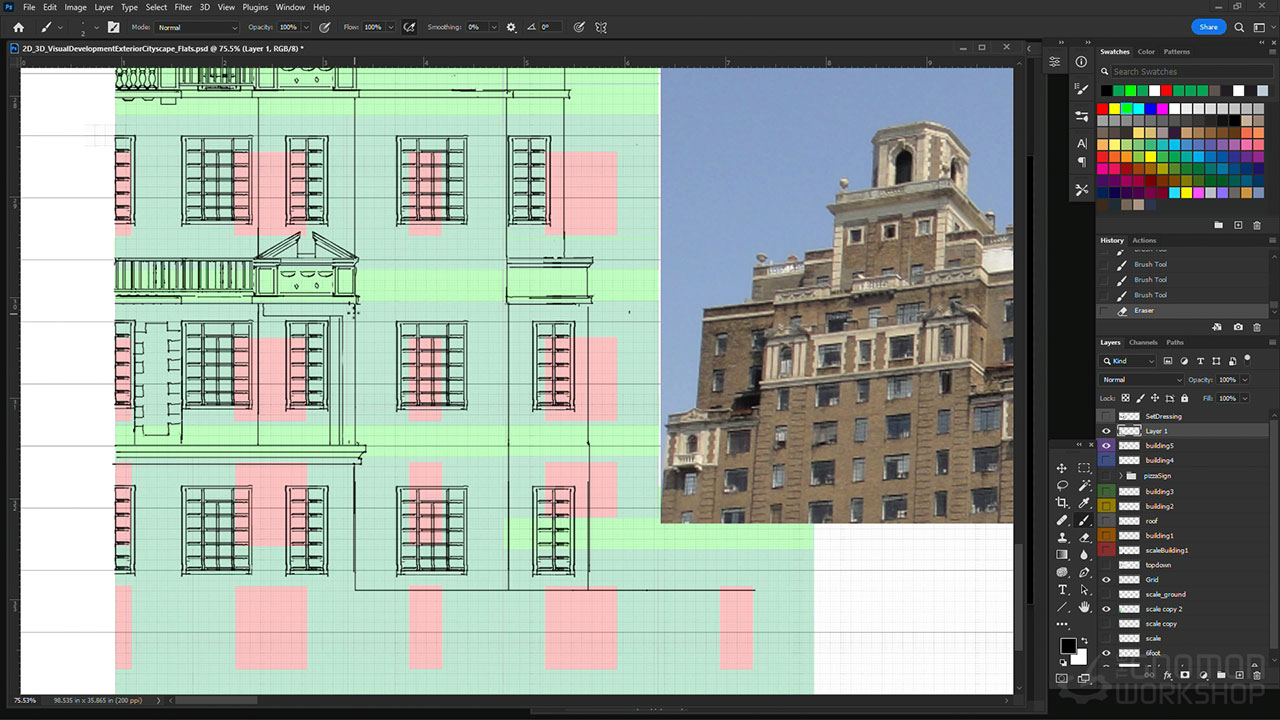 Watch Cityscape Set Design, Volume 2: Texturing, Lighting & Rendering by Tony Ianiro to take your Maya scene through to a professional Photoshop illustration.