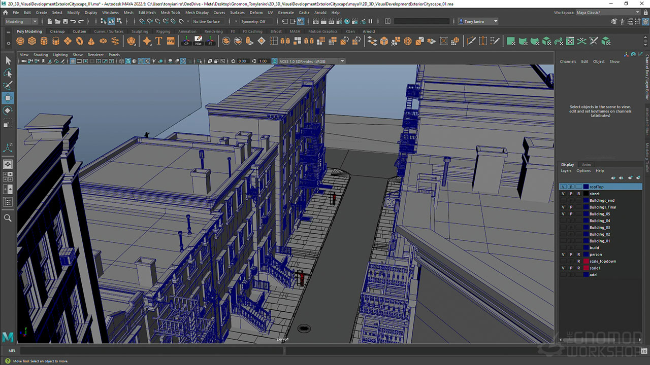 The workshop begins with gathering reference images and using them to create an environment concept thumbnail through photo-bashing. Tony then guides you through the process of building a New York City set, starting in Photoshop to create correct-scale architectural 2D blueprints. These blueprints are then imported into Maya to build a complete production-ready 3D set in a modular and adjustable way. After building the set, Tony covers the basics of texturing, lighting, and camera setups in Maya. The workshop then moves on to cleaning and packaging the 3D file and rendering using Arnold in Maya.