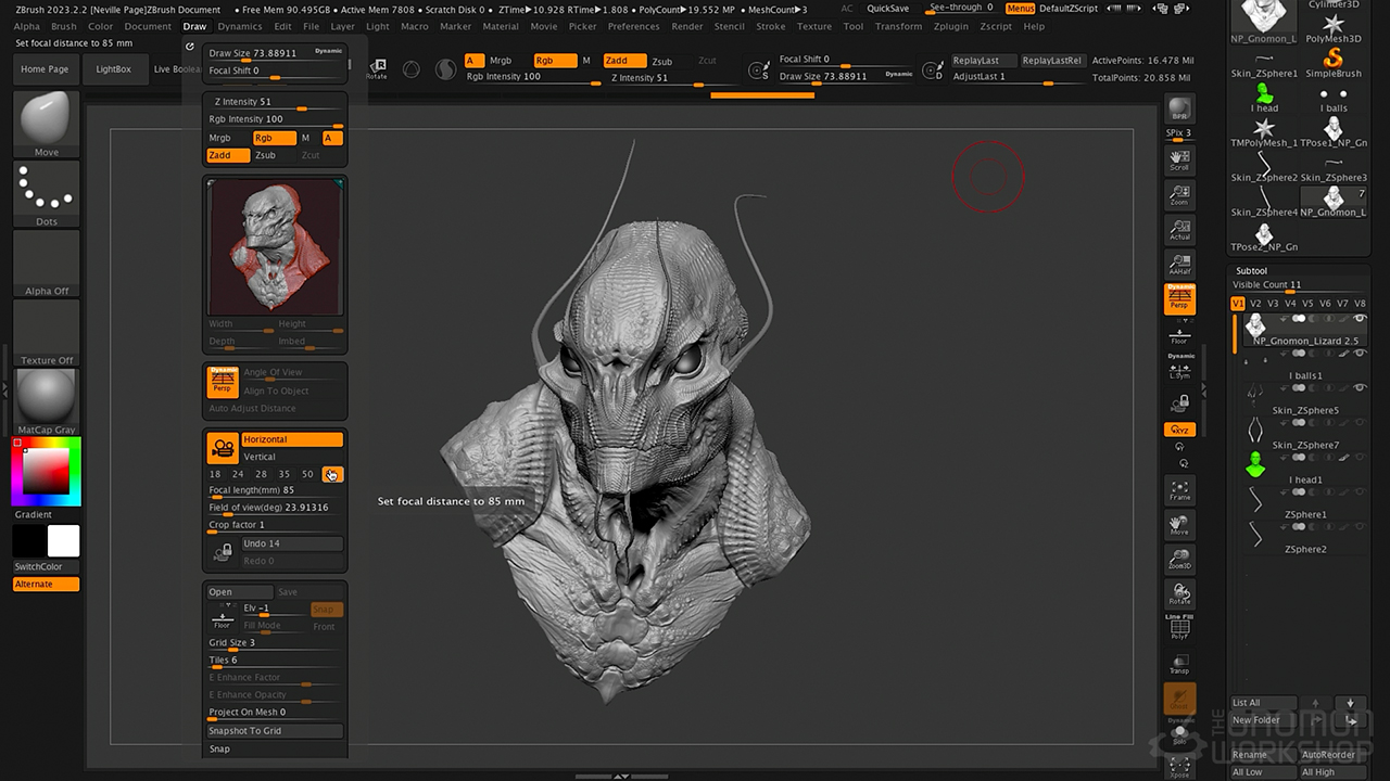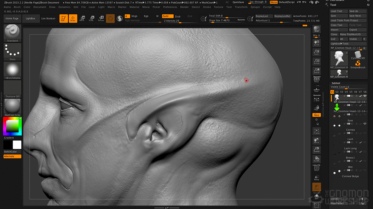 In this insightful workshop that teaches how to create virtual designs that will be turned into practical makeup, Neville begins with the skin: a head scan of himself. Using this head scan data, he demonstrates how to work on top of it in ZBrush, just as he would if he were working with a physical life cast; only, rather than working with real clay, he’s using digital clay to build up the design. Artists can follow along as he designs and builds a character from the ground up, ensuring anatomical believability, practical feasibility, and a strong design foundation while also seeing how he tackles mistakes and happy accidents along the way.