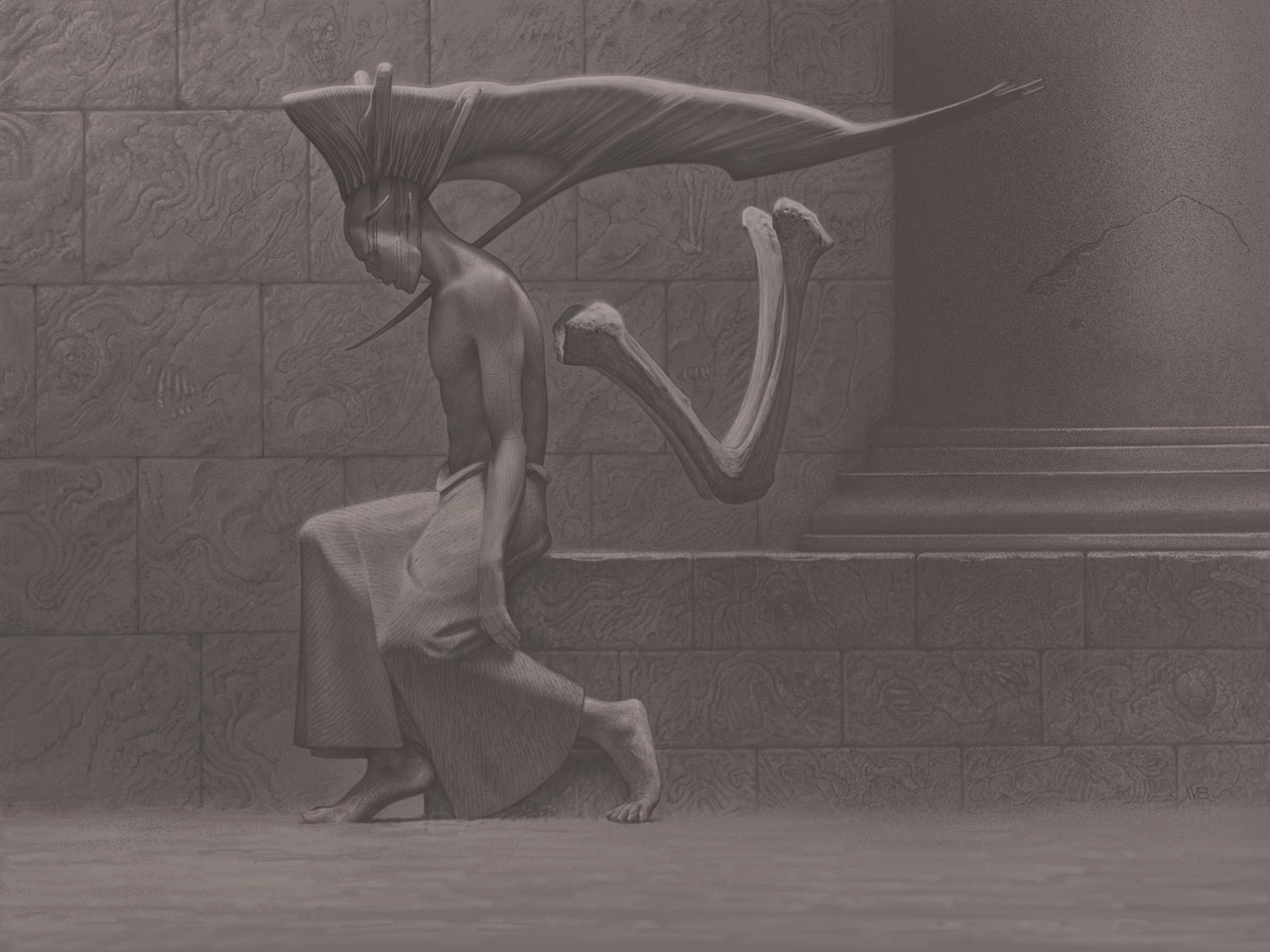 " Watching Wayne Barlowe draw is an intriguing experience. Wayne sets down the lightest of pencil lines as a guide and then, without hesitation, begins the meticulous process of rendering the most astonishingly detailed pencil drawings. As his preparatory lines are so light as to be practically invisible, watching the drawings materialize is akin to developing black and white prints. They simply appear, as if the pencil was a scalpel, cutting away the paper to reveal the images underneath.For someone like myself, who has not the slightest clue where a drawing is going when he begins, there's something alchemical about Wayne's expertise."